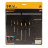 Набор Denzel 12213 состоит из 8 отверток с трехкомпонентными рукоятками, изготовленных из стали CrV. Они предназначены для работы с резьбовыми крепежами типа PH и SL. Благодаря намагниченным наконечникам направлять отвертки с крепежом можно одной рукой. Отвертка с длиной стержня 38 мм удобна для работы в ограниченном пространстве. Набор подходит для профессионального использования.ПреимуществаПрочность — стержень изготовлен из хромованадиевой стали и закален до твердости 55 HRC.Износостойкость и защита от коррозии — шлиц фосфатирован, а на стержень нанесено никелевое покрытие.Продуманная маркировка — цветное кольцо на затыльнике соответствует типоразмеру отвертки, что облегчает поиск нужного инструмента.Комфортное использование — эргономичная 3-компонентная рукоятка с резиновыми вставками и подпальцевыми выемками не выскальзывает из ладони и позволяет долго работать без усталости.Удобное хранение — отверстие в рукоятке позволяет подвешивать отвертку на крючок или скобу.