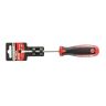 Отвертка Matrix «Profi» 11814, SL5,5 х 100 мм, из стали S2, с двухкомпонентной рукояткой, служит для монтажа и демонтажа крепежа со шлицем Slotted «минус». Профессиональная отвертка станет незаменимым помощником при осуществлении монтажных, строительных и ремонтных работ. Благодаря стержню длиной 100 мм можно закручивать и откручивать крепеж в углублениях.ПреимуществаТвердость и прочность обеспечивается высоким качеством материалов: стержень выполнен из стали CrV, а жало — из закаленной инструментальной стали S2.Рабочая часть фосфатирована, таким образом улучшается сцепление со шлицем крепежа.Намагниченное жало позволяет зафиксировать крепеж и освободить одну руку для удержания закрепляемой детали.Маркировка с рабочими параметрами на рукоятке отвертки обеспечивает удобство эксплуатации.Отвертка произведена на Тайване с высоким контролем качества, что гарантирует ее надежность и долговечность.Трехкомпонентная рукоятка со специальными насечками надежно лежит в руке.Рукоятка выполнена методом цельного литья, что позволяет добиться прочного сцепления с рабочей частью.